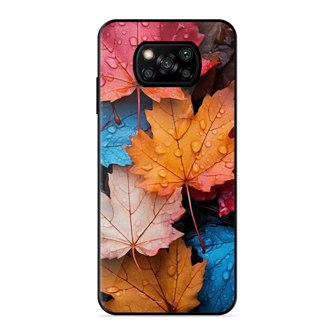 Tempered Glass Coated Metal Back Case for Poco X3 Pro Colourfull Leaves