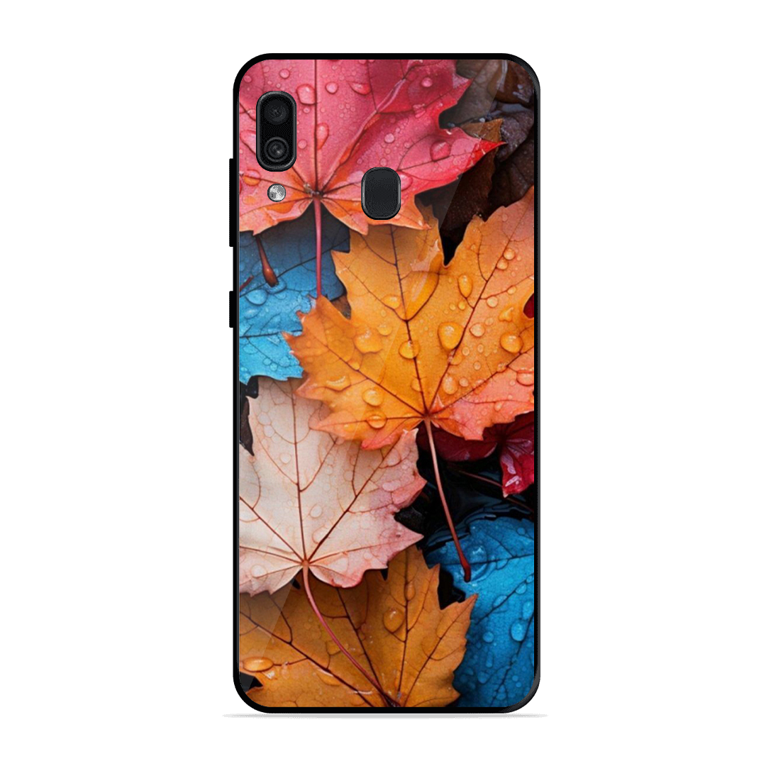 Tempered Glass Coated Metal Back Case for Samsung Galaxy A30 Colourfull Leaves