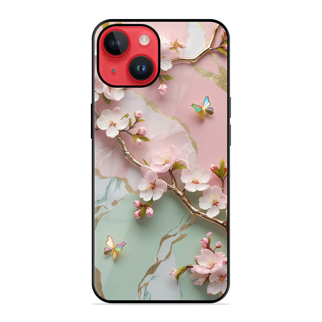 Tempered Glass Coated Metal Back Case for Apple Iphone 14 Flower With Butterfly
