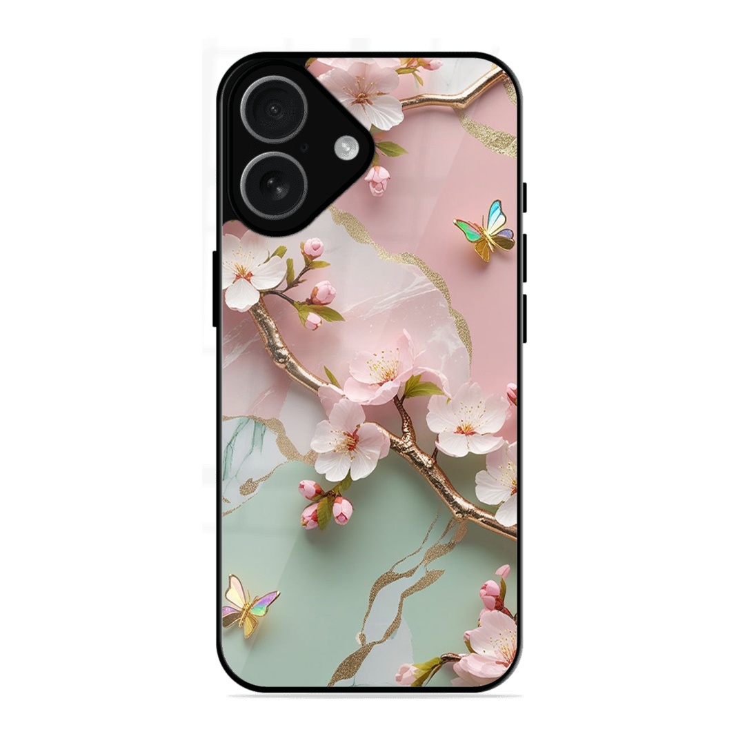 Tempered Glass Coated Metal Back Case for Apple-Iphone-17 Flower With Butterfly