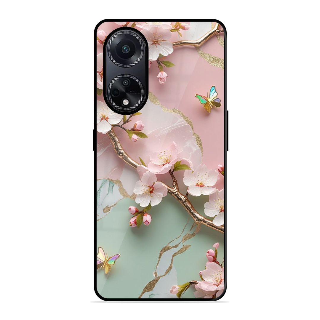 Tempered Glass Coated Metal Back Case for Oppo F23 5G Flower With Butterfly