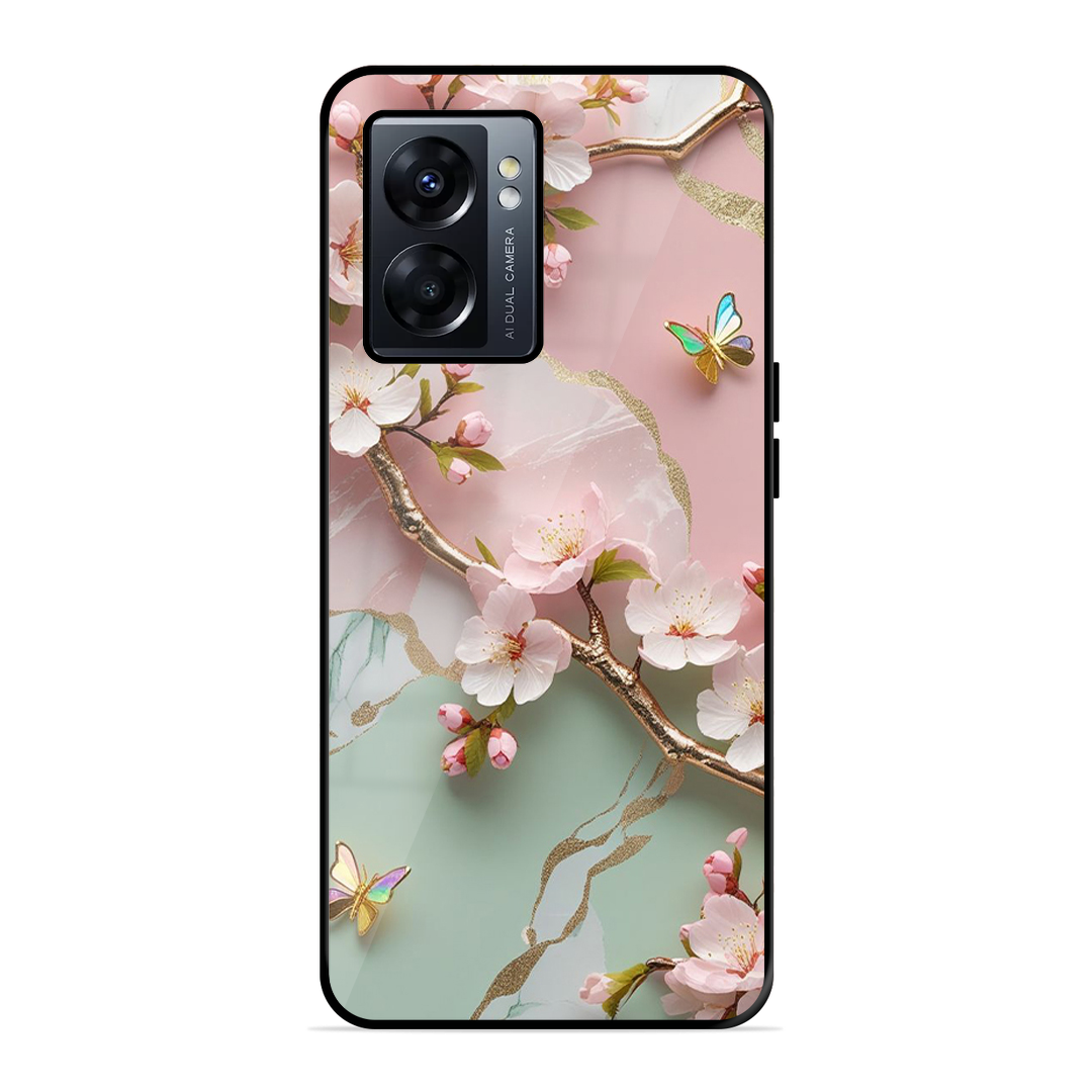 Tempered Glass Coated Metal Back Case for Oppo K10 5G Flower With Butterfly