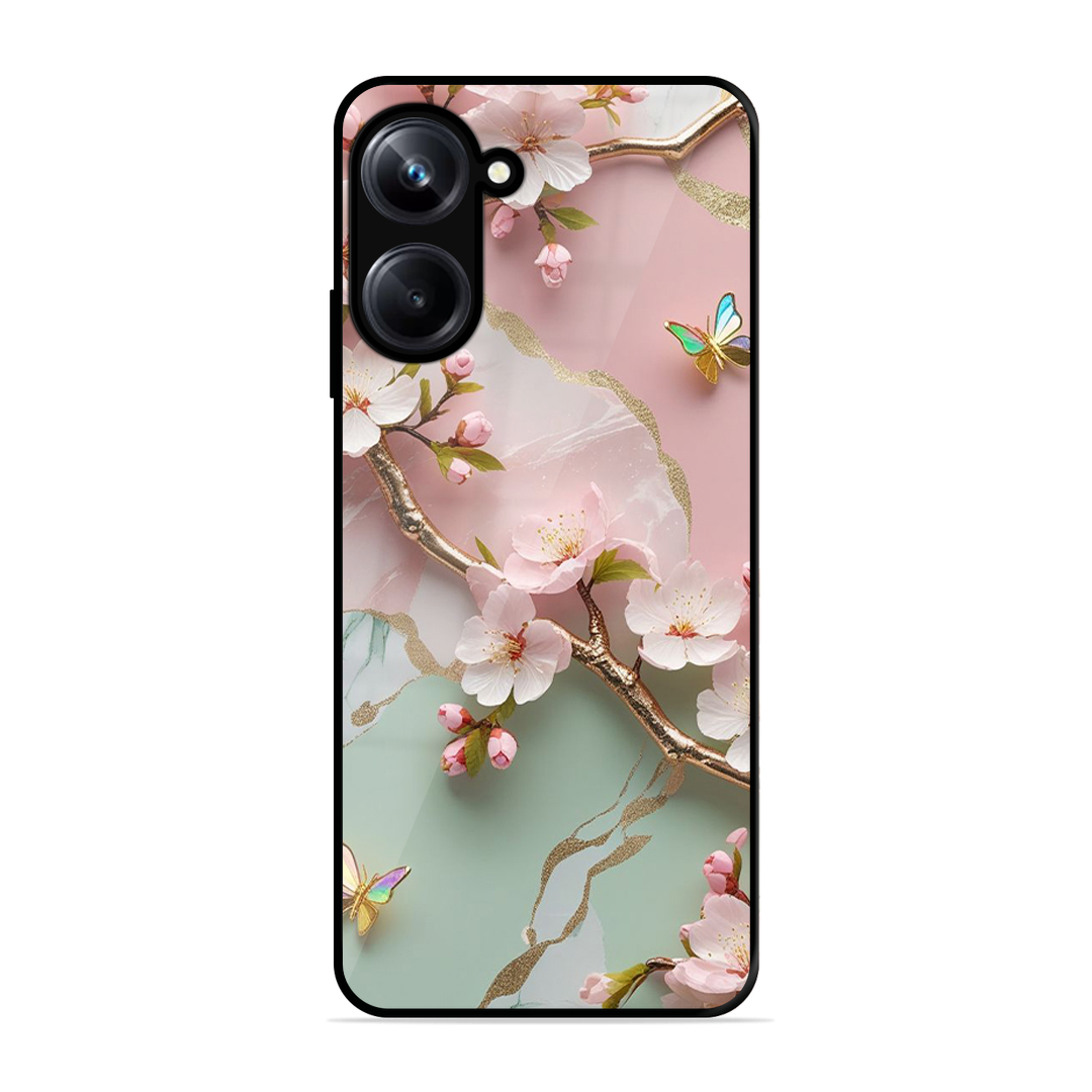 Tempered Glass Coated Metal Back Case for Realme 10 Pro 5G Flower With Butterfly