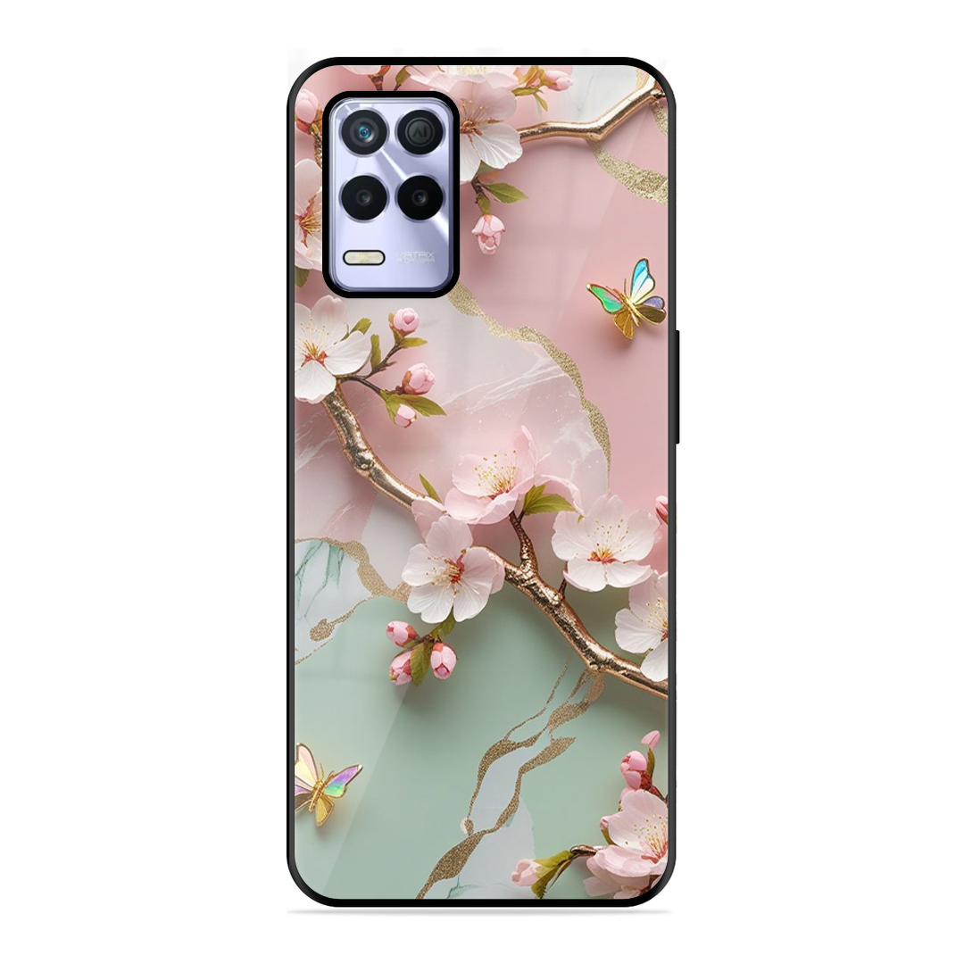 Tempered Glass Coated Metal Back Case for Realme 8S 5G Flower With Butterfly