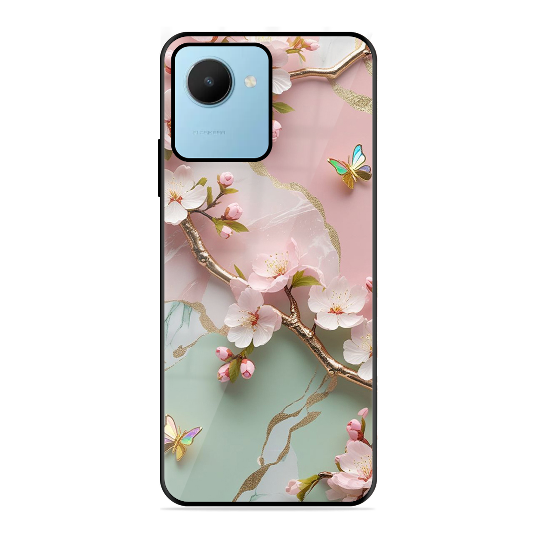 Tempered Glass Coated Metal Back Case for Realme C30S Flower With Butterfly