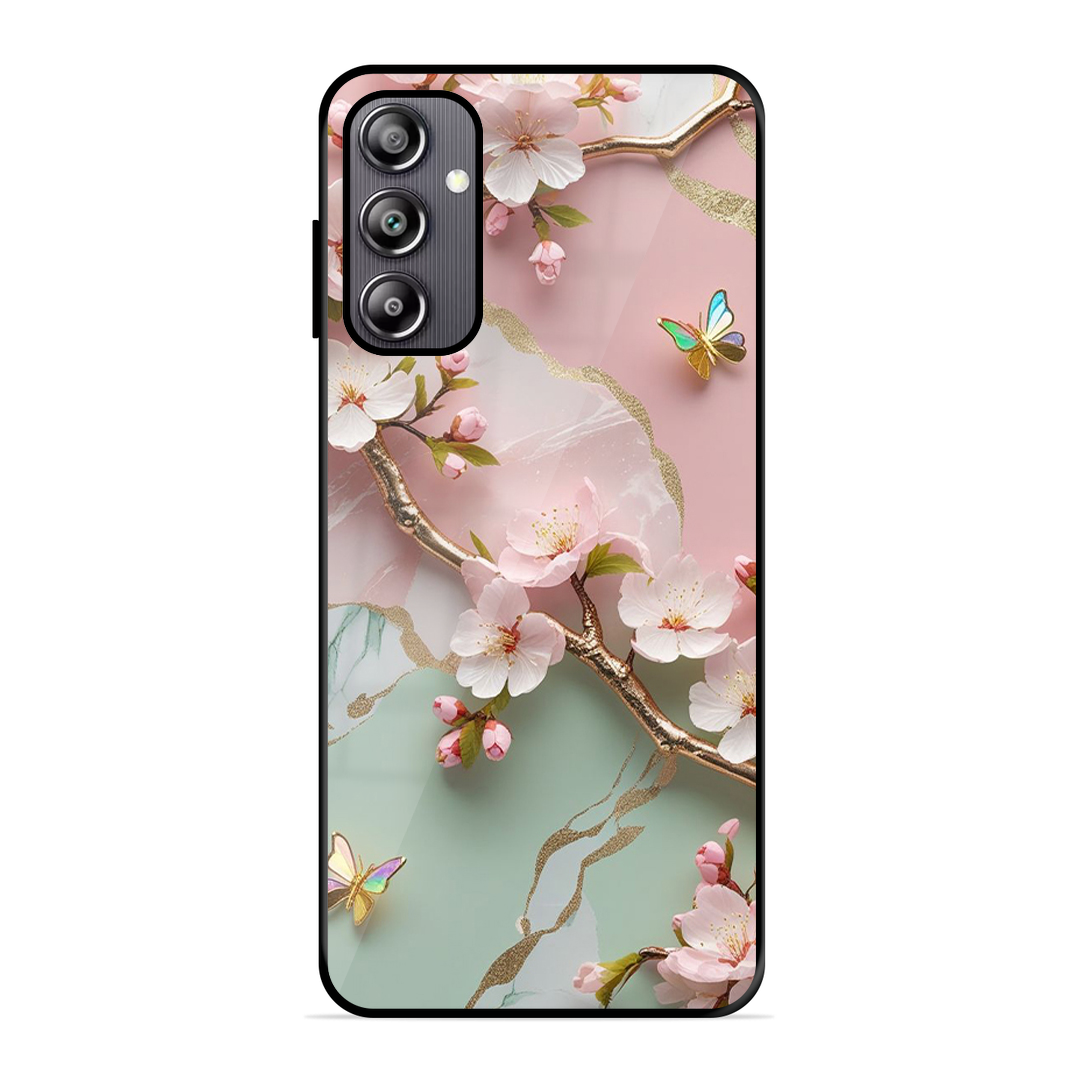 Tempered Glass Coated Metal Back Case for Samsung Galaxy A14 5G Flower With Butterfly