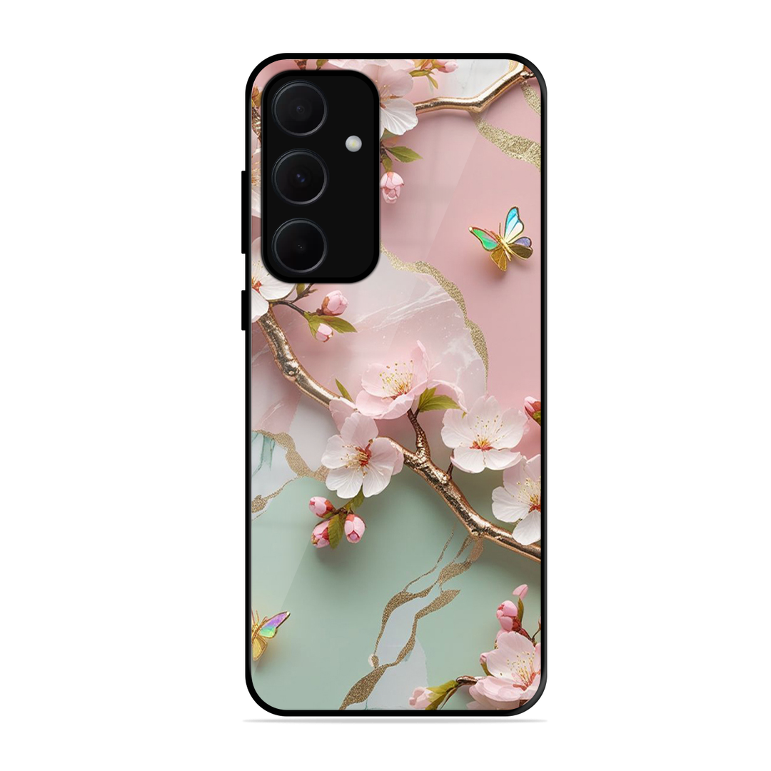 Tempered Glass Coated Metal Back Case for Samsung Galaxy A35 5G Flower With Butterfly