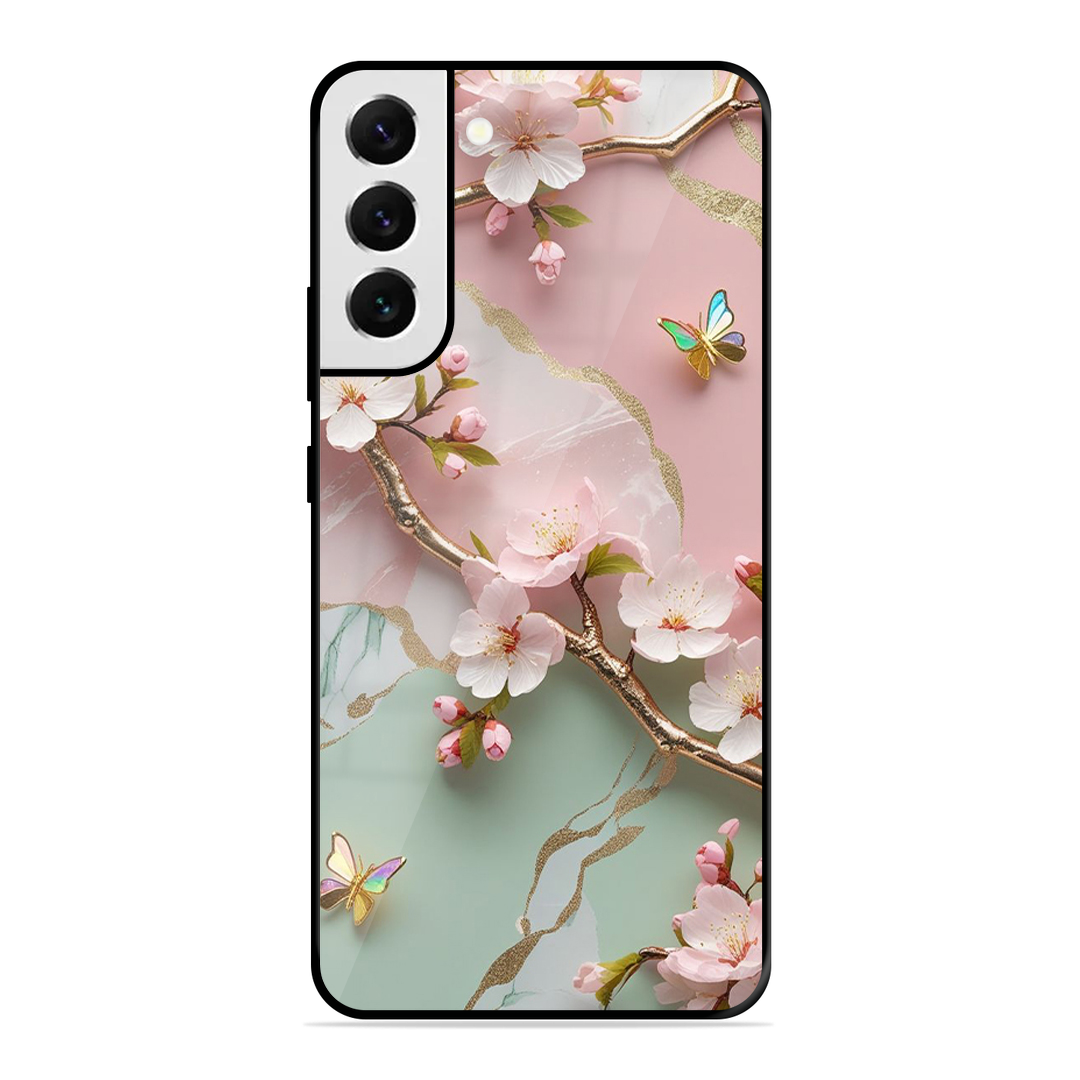 Tempered Glass Coated Metal Back Case for Samsung Galaxy S21 Fe 5G Flower With Butterfly