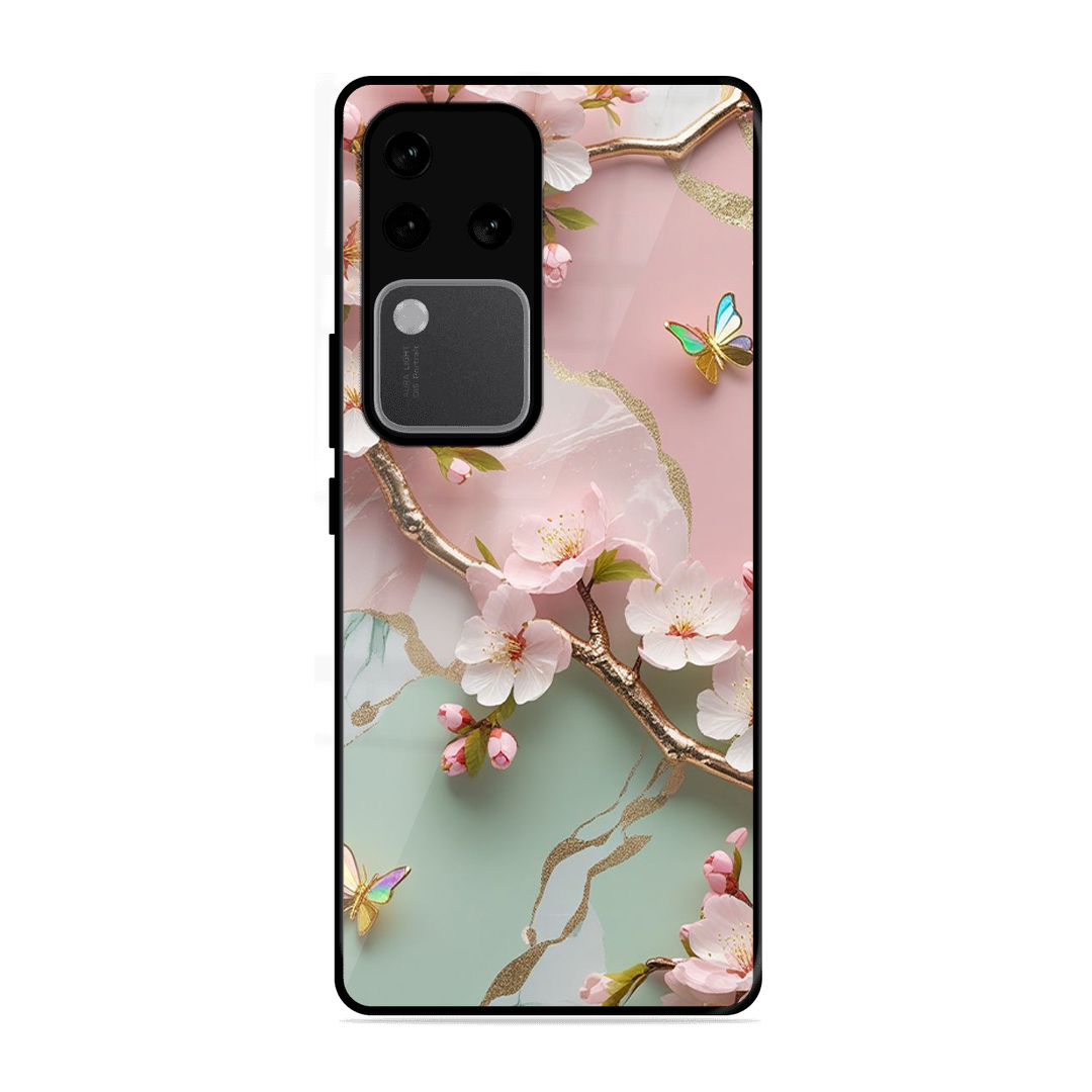 Tempered Glass Coated Metal Back Case for Vivo V30 Pro 5G Flower With Butterfly