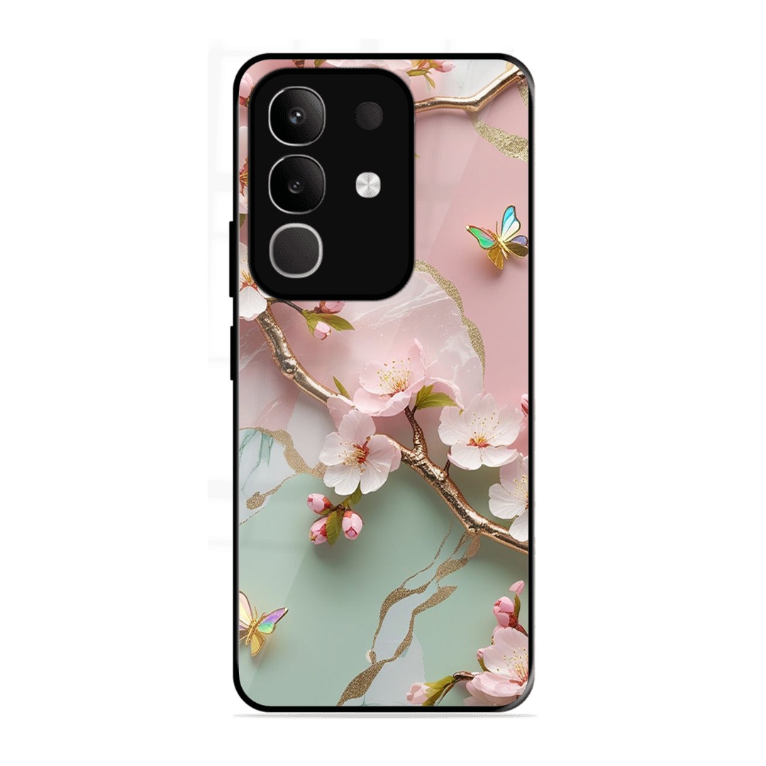 Tempered Glass Coated Metal Back Case for Vivo-Y31-Pro 5G Flower With Butterfly