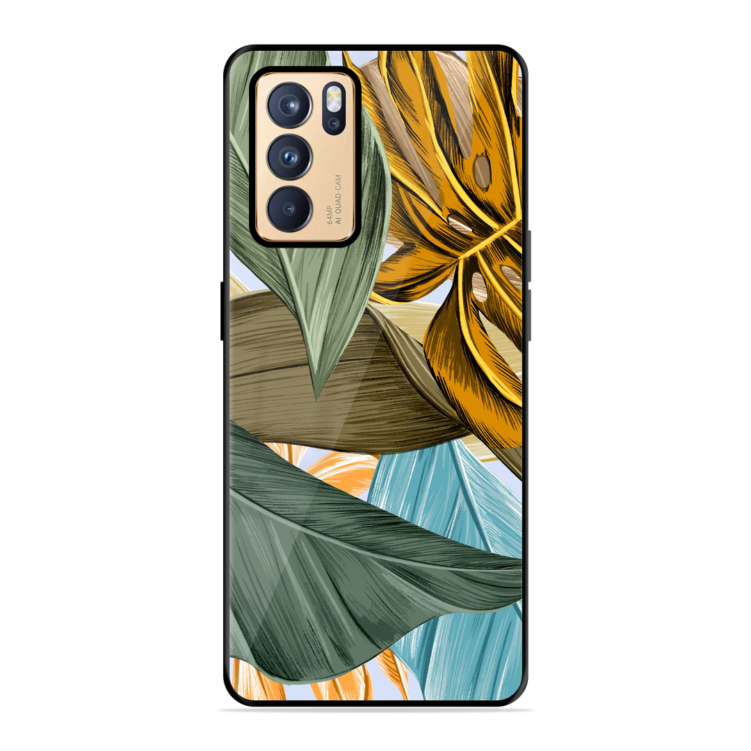 Introducing the ultimate fusion of bold design and rugged protection: the Tempered Glass Coated Metal Back Case for {brand} Oppo Reno 6 Pro 5G Leaves. Thoughtfully crafted for those who demand both high performance and high style, this premium case redefines mobile protection with a stunning, custom twist.