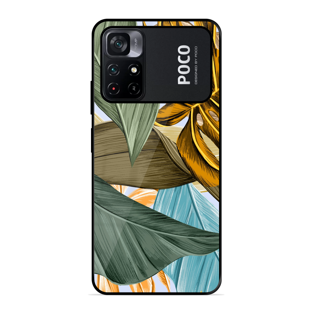 Tempered Glass Coated Metal Back Case for Poco M4 Pro 5G Leaves