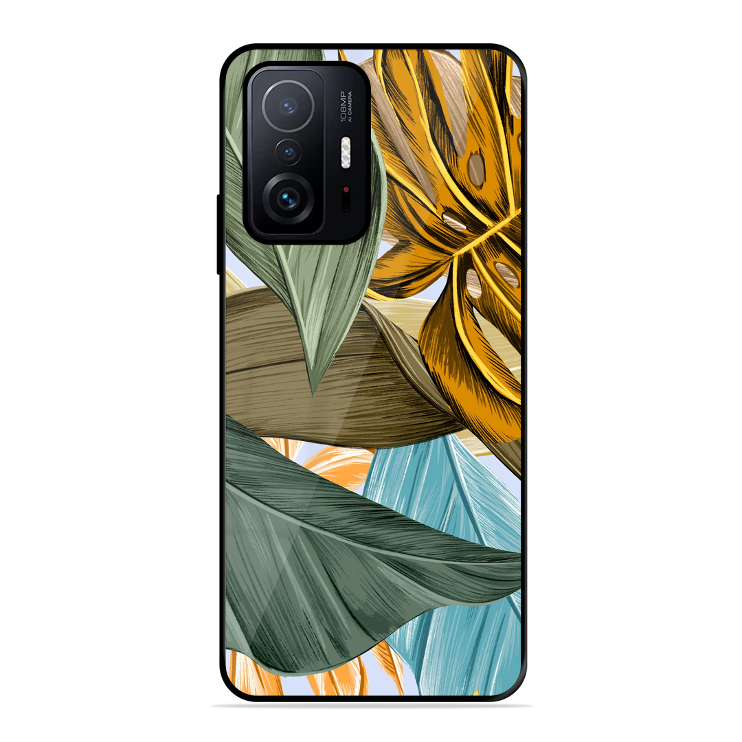 Tempered Glass Coated Metal Back Case for Xiaomi Mi 11T Pro 5G Leaves