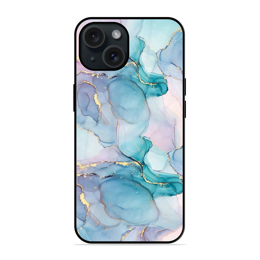 Tempered Glass Coated Metal Back Case for Apple Iphone 15 Marble Texture