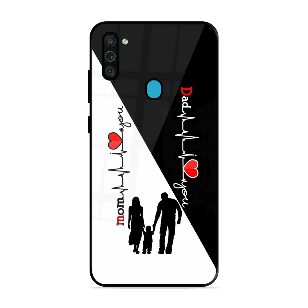 Tempered Glass Coated Metal Back Case for Samsung Galaxy M11 Mom & Dad