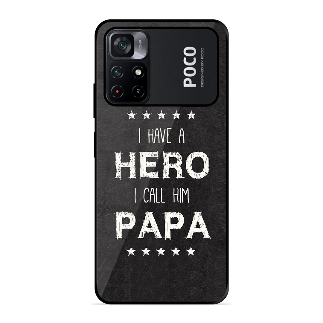 Introducing the ultimate fusion of bold design and rugged protection: the Tempered Glass Coated Metal Back Case for {brand} Poco M4 Pro 5G PAPA Is Hero. Thoughtfully crafted for those who demand both high performance and high style, this premium case redefines mobile protection with a stunning, custom twist.