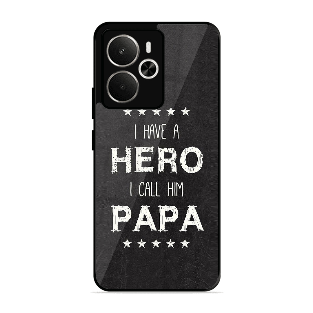 Introducing the ultimate fusion of bold design and rugged protection: the Tempered Glass Coated Metal Back Case for {brand} Realme-145G PAPA Is Hero. Thoughtfully crafted for those who demand both high performance and high style, this premium case redefines mobile protection with a stunning, custom twist.