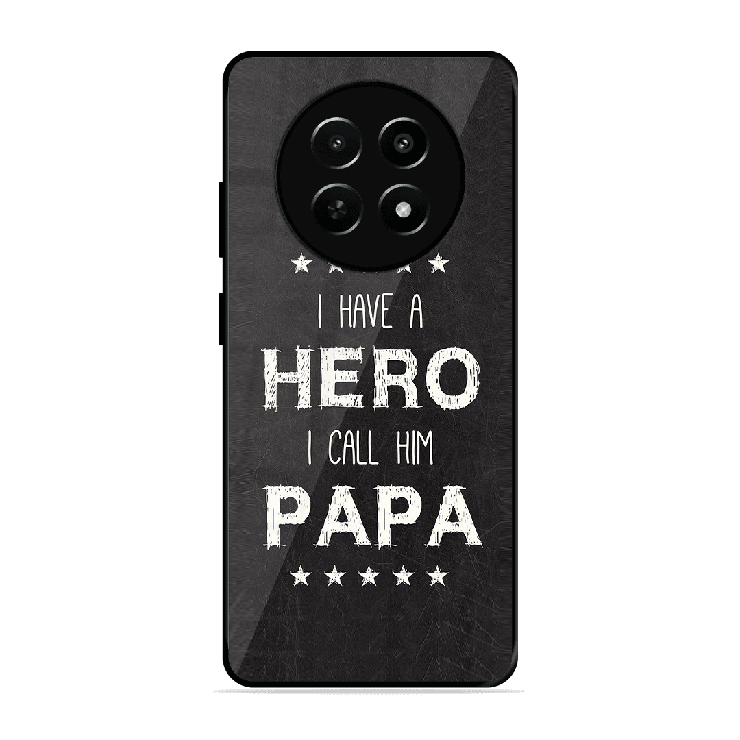 Introducing the ultimate fusion of bold design and rugged protection: the Tempered Glass Coated Metal Back Case for {brand} Realme C65 5G PAPA Is Hero. Thoughtfully crafted for those who demand both high performance and high style, this premium case redefines mobile protection with a stunning, custom twist.