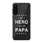 Introducing the ultimate fusion of bold design and rugged protection: the Tempered Glass Coated Metal Back Case for {brand} Samsung-Galaxy-M165G PAPA Is Hero. Thoughtfully crafted for those who demand both high performance and high style, this premium case redefines mobile protection with a stunning, custom twist.