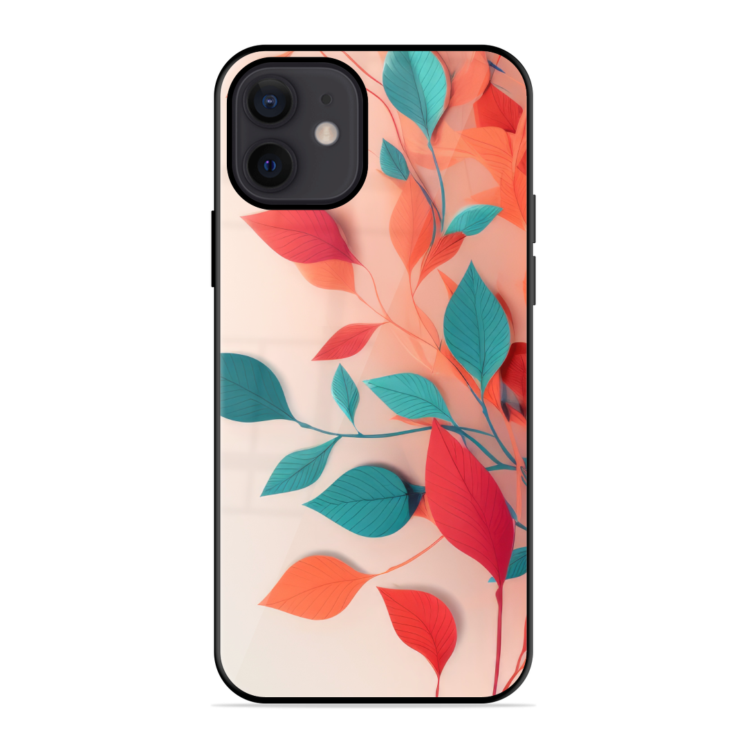 Tempered Glass Coated Metal Back Case for Apple Iphone 12 Mini Vibrant Leaves