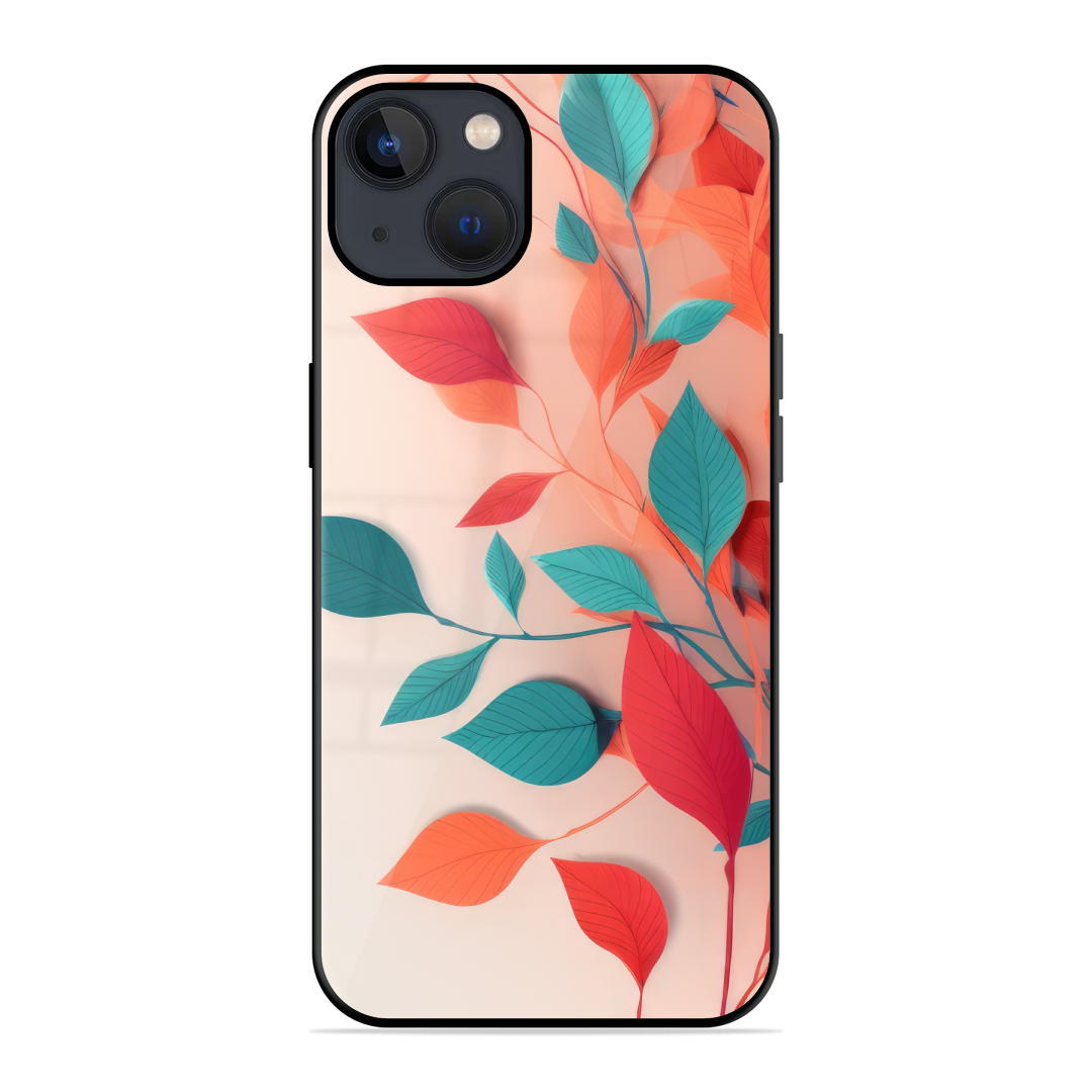 Tempered Glass Coated Metal Back Case for Apple Iphone 13 Vibrant Leaves